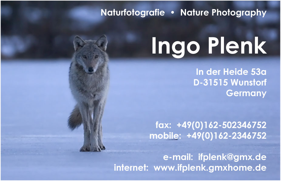 | Hinweise: Alle Fotos auf meiner Homepage wurden von mir aufgenommen und unterliegen dem Copyright, d.h. die Fotos sind mein Eigentum und eine Nutzung bedarf meines ausdrücklichen schriftlichen Einverständnisses. Fotos und Bilder anderer Autoren sind gekennzeichnet. Alle Fotos sind digital aufgenommen. Kein Foto ist digital manipuliert. Für die Internetdarstellung wurden lediglich notwendige Anpassungen von Tonwert, Gradation und Farbsättigung sowie Schärfungen vorgenommen. Bei einigen Fotos wurde der Ausschnitt verändert. Fotos von Tieren, welche im Gehege oder in Gefangenschaft fotografiert wurden, sind mit "C" (captive) gekennzeichnet. |