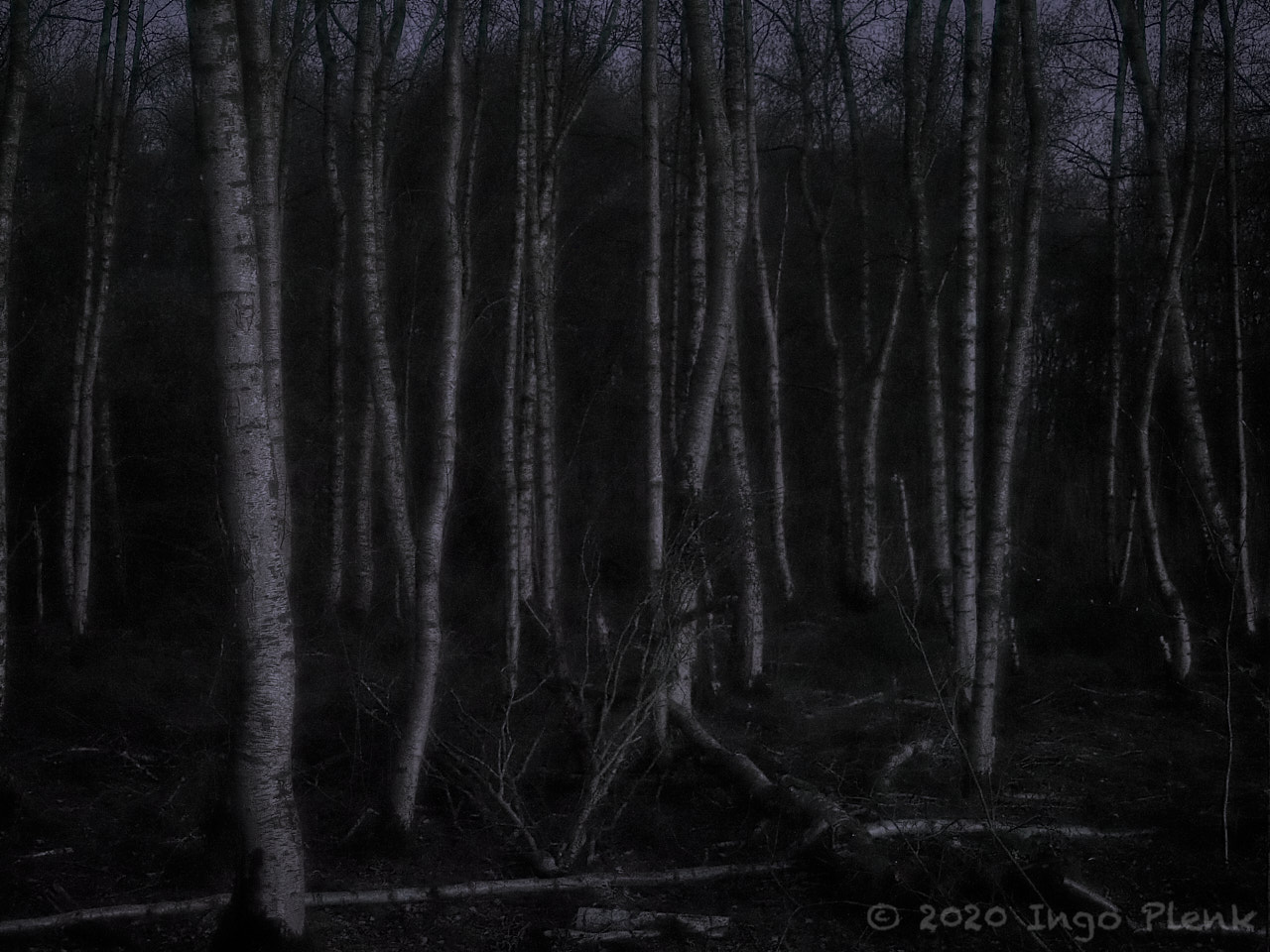 Im letzten schwindenen Licht des Tages und vor dem zu erwartenden Mondaufgang sind die weißrindigen Stämme der Birken nur noch schwer wahrzunehmen.